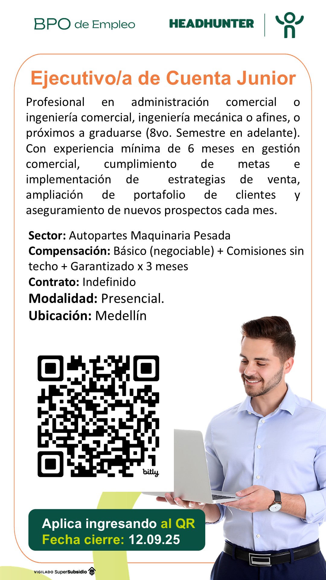 ¡Únete a nuestra empresa líder en el sector y conviértete en nuestro próximo Ejecutivo de Cuenta! Estamos buscando un Ejecutivo de Cuentas motivado y apasionado, capaz de implementar estrategias de venta efectivas y ampliar nuestro portafolio de clientes. En este rol, tendrás la oportunidad de trabajar con un equipo dinámico, asegurando nuevos prospectos cada mes y cumpliendo con metas comerciales. Si eres profesional en administración comercial, ingeniería comercial, ingeniería mecánica, afines, o estás próximo a graduarte, y tienes al menos 6 meses de experiencia en gestión comercial, ¡queremos conocerte!